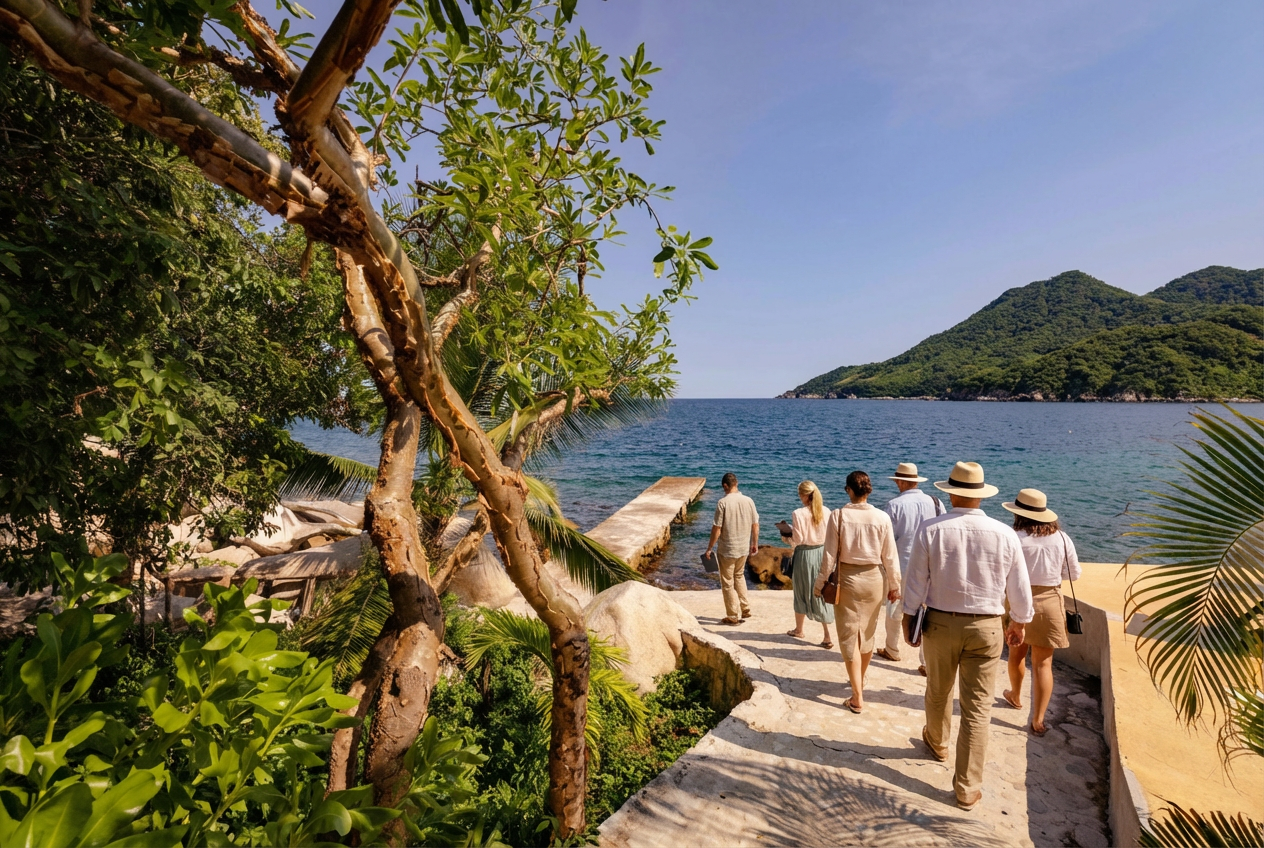 Corrales Bay is accessed by boat from Puerto Vallarta, with guests arriving together to a private destination. Once on property, the resort is fully walkable, allowing your group to settle in without ongoing transportation needs. Arrival details are shared in advance so guests know what to expect before traveling.